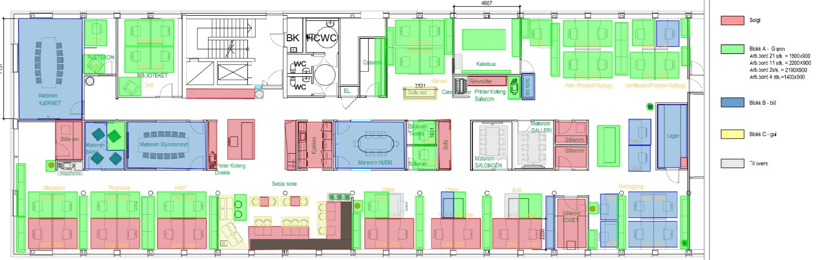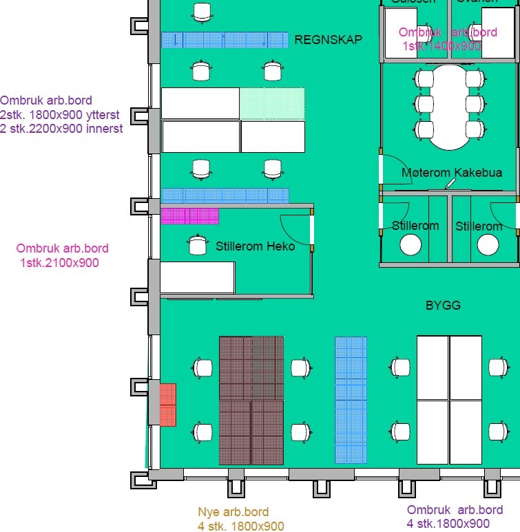 Merk tydelig alt som skal flytte og alt som skal stå igjen i henhold til tegning. Bruk farget tape eller spritusjer med forskjellige farge for å følge opp fargekodingen. Husk å merk hver enkelt del på møbler som demonteres.