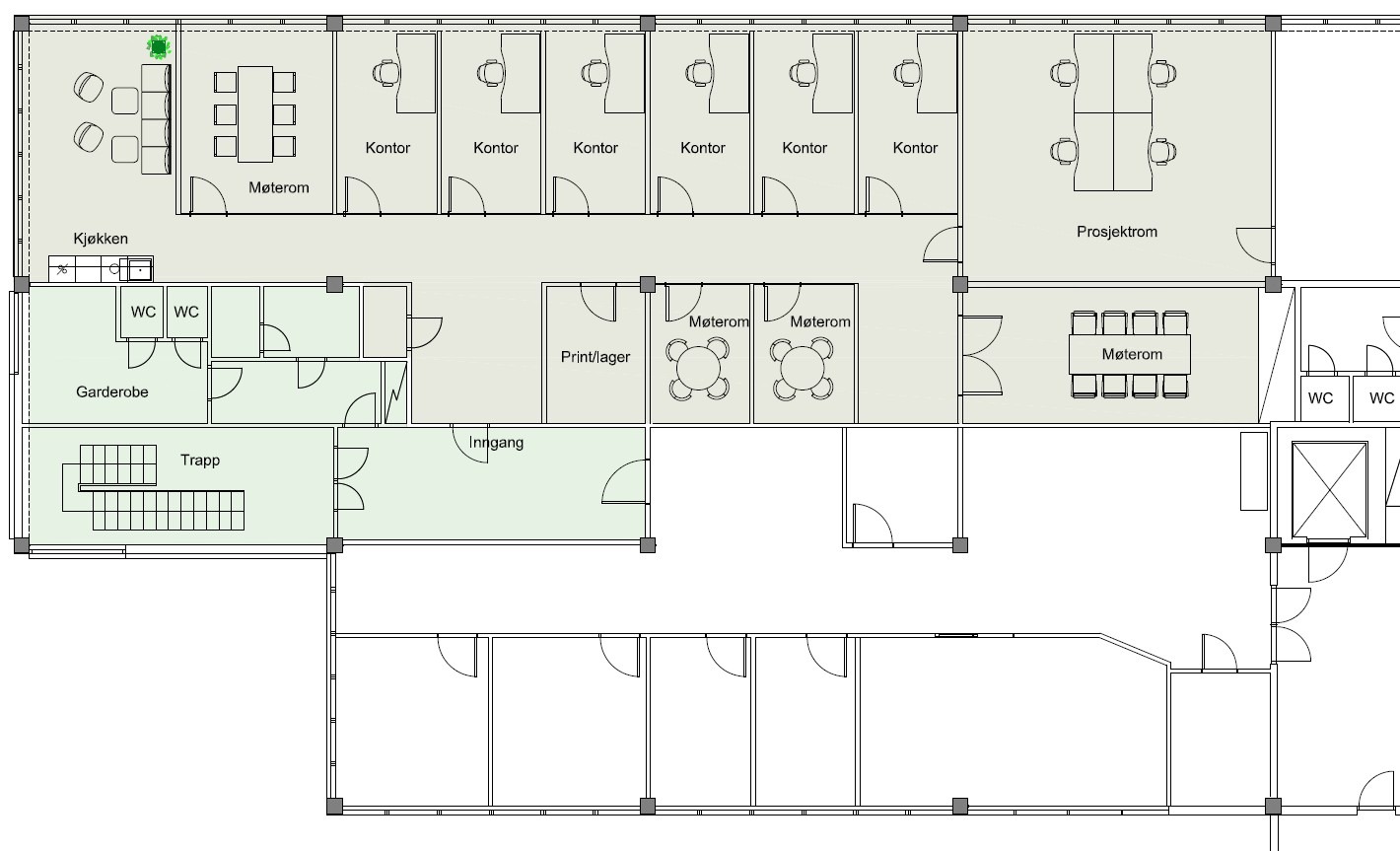 Det ledige lokalet i andre etasje har idag cellekontorer, et stort og et lite møterom. Parkettgulv og hvitmalte vegger.