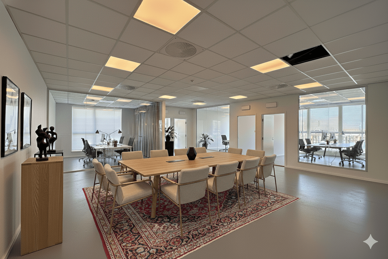 Se hvordan kontoret kan bil ferdig innredet. Her har vi fått hjelp av AI