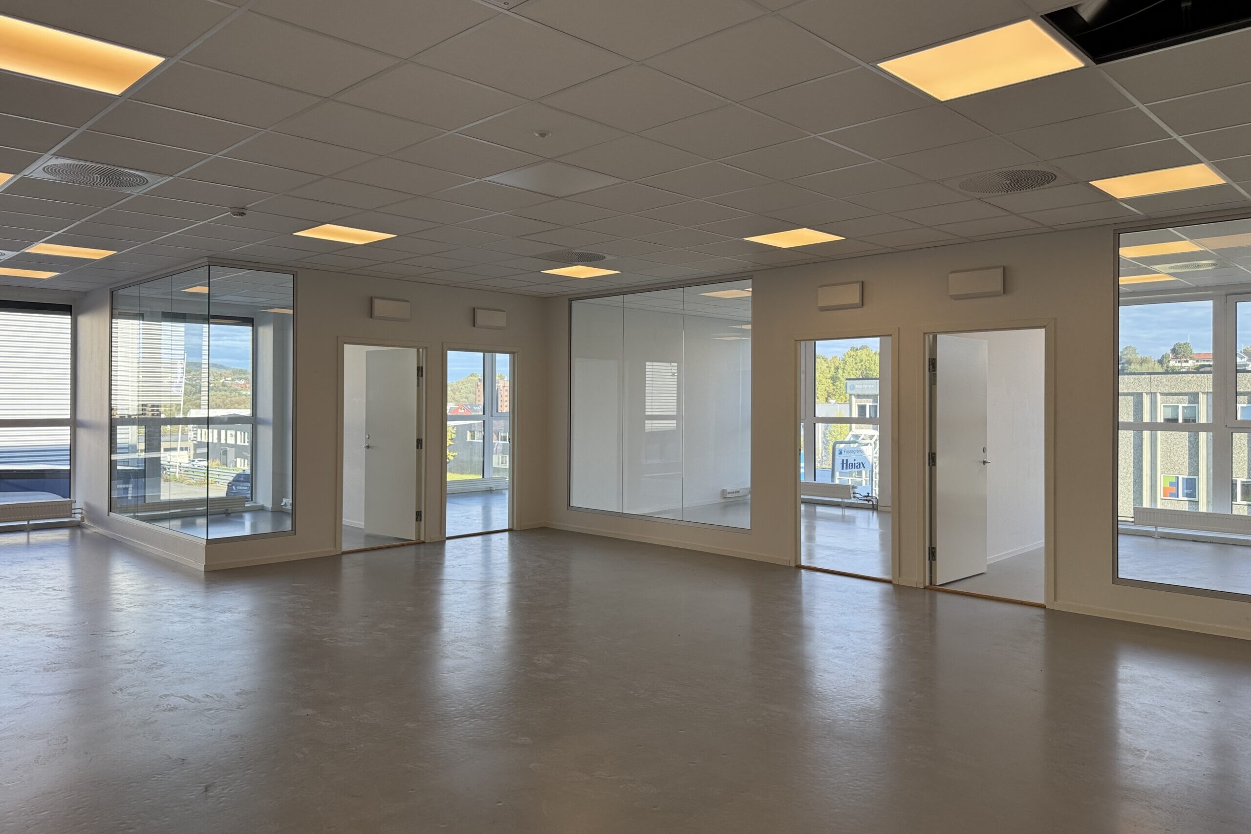 Trivelige kontorlokaler i høy første etasje. Idag med kontorlandskap. 3 kontorer, møterom og kjøkkenkrok. Kan tas i bruk som det står, eller endres etter fremtidig leietakers behov.